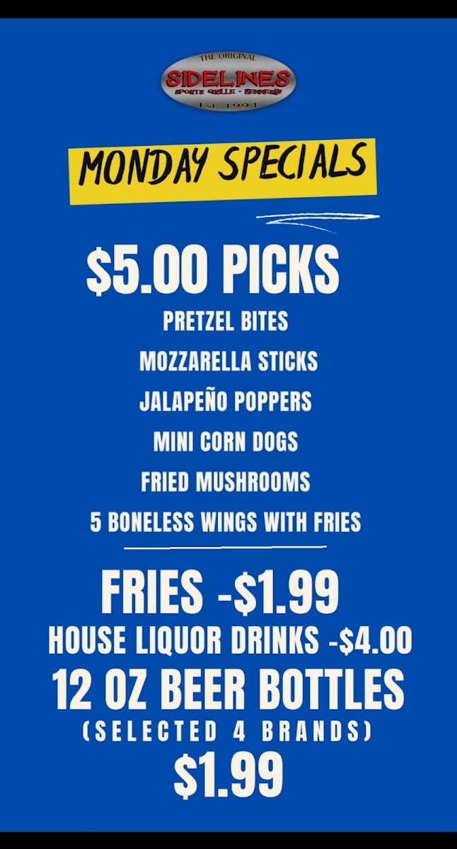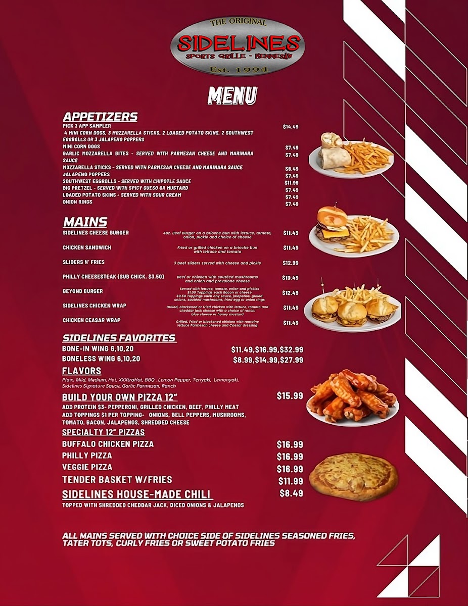 Welcome to Sidelines Sports Grille, Kennesaw's go-to destination for great food and vibrant socializing. Conveniently located at 840 Ernest W Barrett Pkwy NW, this lively venue offers a diverse menu that shines with its delicious array of starters and hearty mains. The Pick 3 App Sampler is a must-try, featuring favorites like mini corn dogs and jalapeno poppers that perfectly set the tone for your outing.